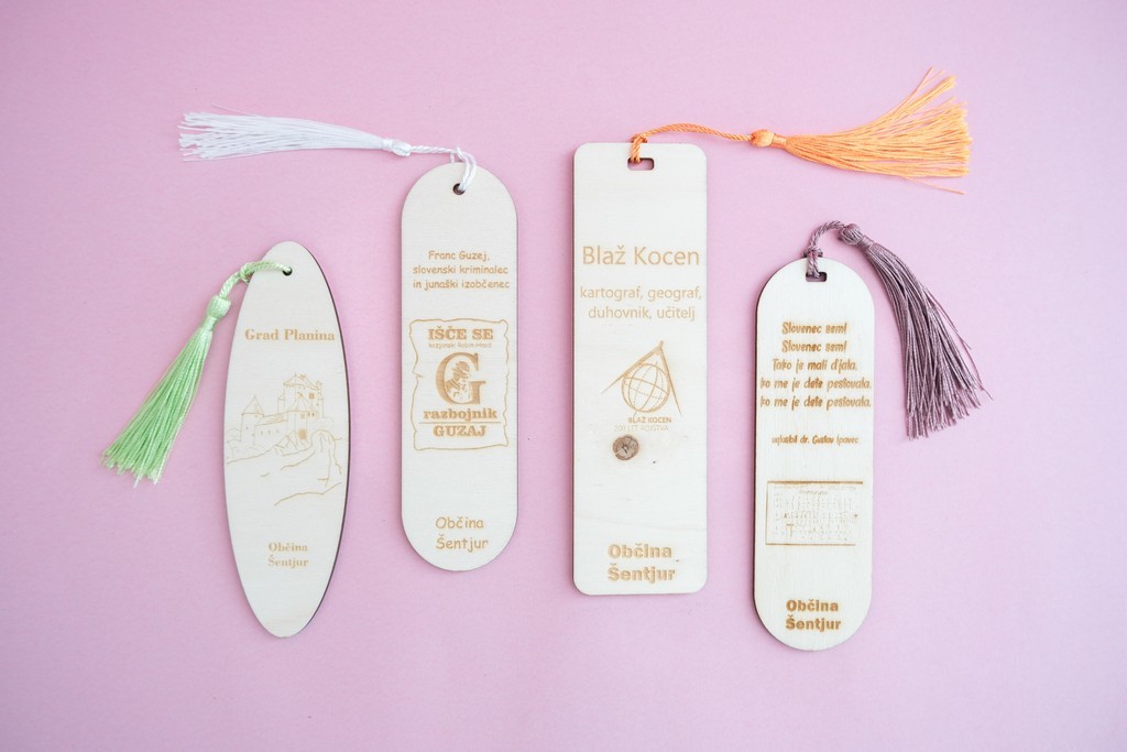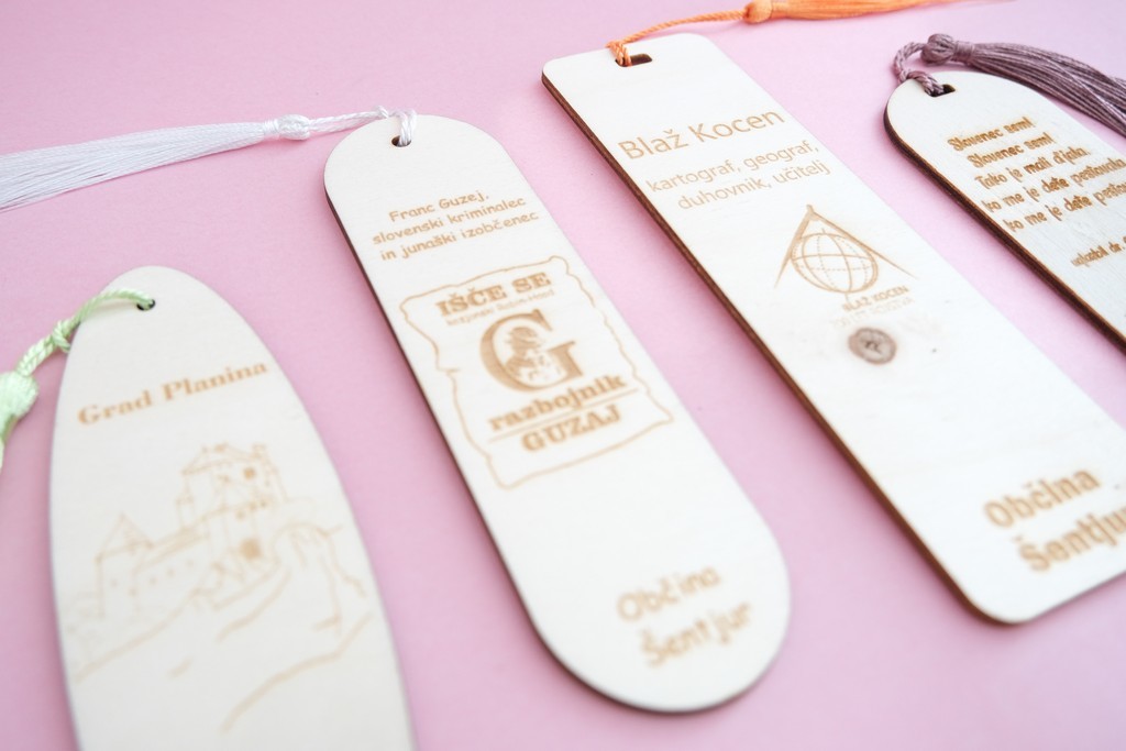 Lesene knjižne kazalke s šentjurskimi motivi lokalnih ustvarjalcev.