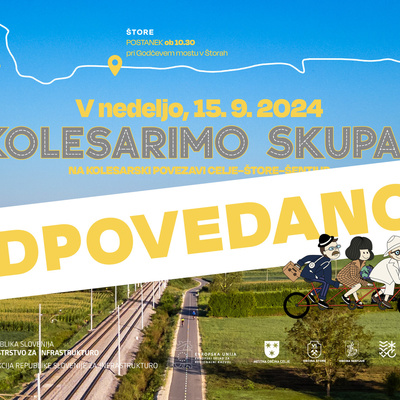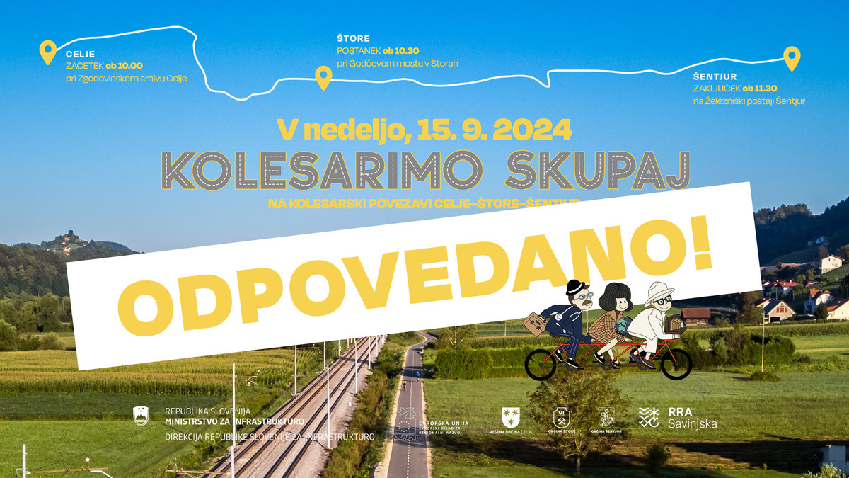 Zaradi slabe vremenske napovedi bomo skupno kolesarjenje in slavnostno odprtje kolesarske povezave Celje-Štore-Šentjur, ki je bilo načrtovano za nedeljo, 15. septembra 2024, prestavili na drug termin.